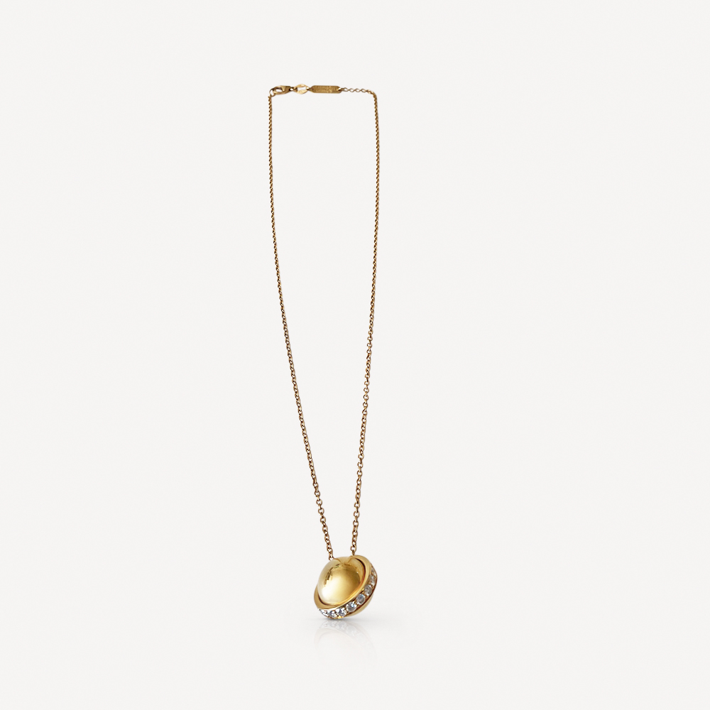 Pendentif Possession Piaget d’occasion en or jaune 750/1000 (18K). Ce pendentif se distingue par son design emblématique avec une sphère ornée d’un anneau central rotatif serti d’une ligne de diamants qui ajoutent une brillance tout autour de l’anneau. Bijou Piaget signé.