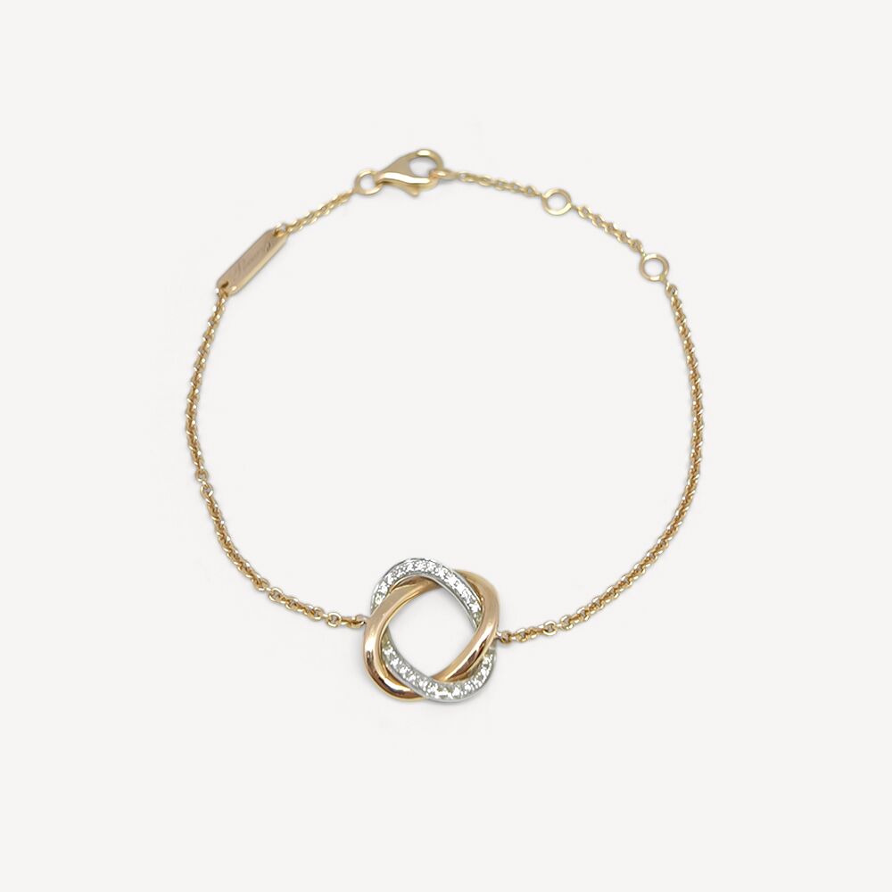 Bracelet Tresse Poiray d’occasion en or jaune et or blanc 750/1000 (18 carats) pavé de diamants. Ce bijou présente 2 brins d’or de 13 mm délicatement entrelacés, pour former un cercle tressé, sur une chaîne maille forçat.