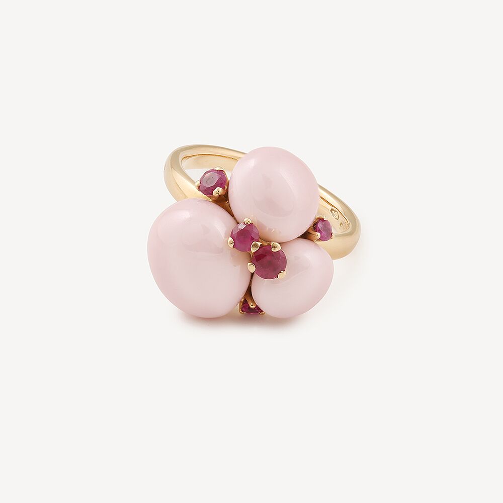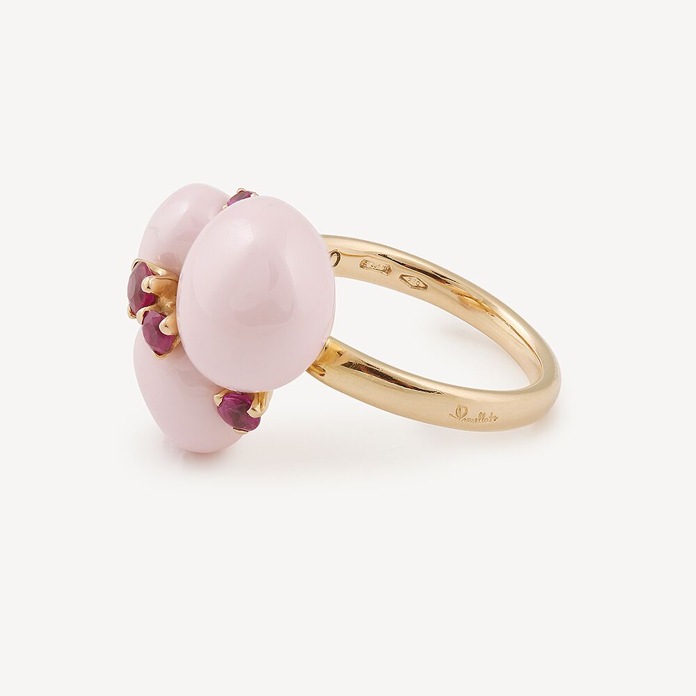 Bague Capri Pomellato de seconde main en or rose 18 carats (750/1000). Trois céramiques rose réhaussées de cinq rubis de taille ronde.