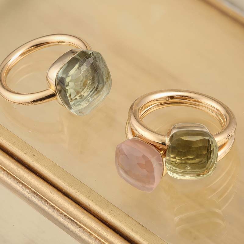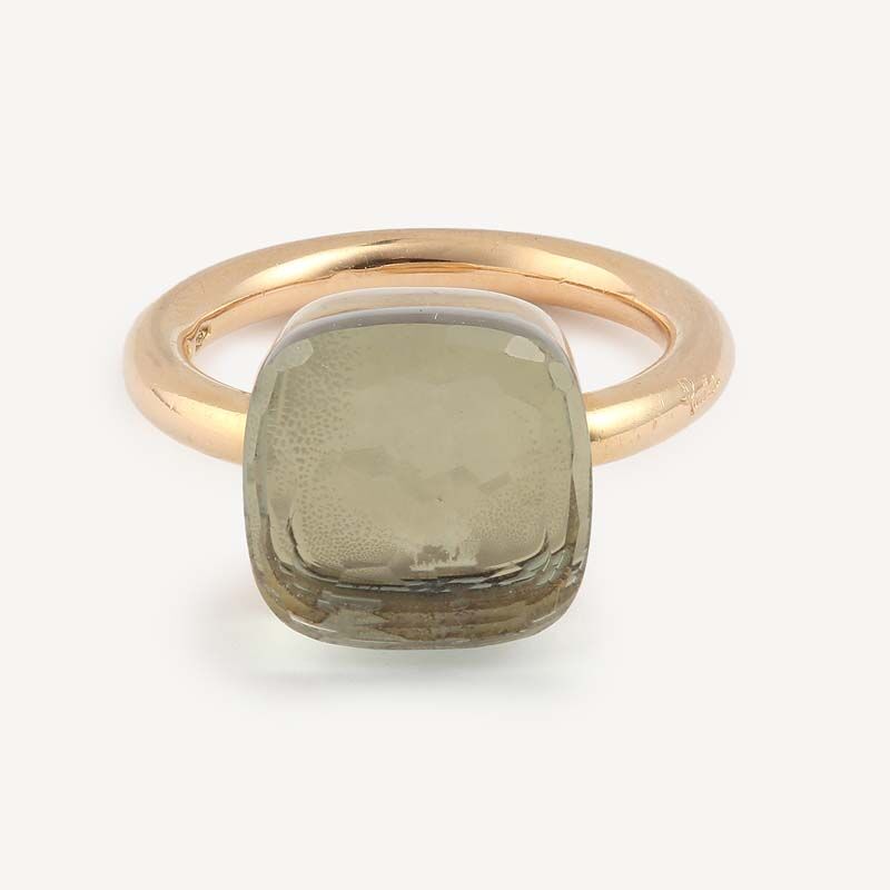 Lancée en 2001, la collection Nudo est devenue une ligne iconique de la marque de joaillerie italienne Pomellato. Elle se compose de bagues en or rose ou blanc ornées de pierres précieuses ou semi-précieuses de toutes les couleurs. On les porte souvent par deux ou trois pour des combinaisons hautes en couleur. « Nudo » signifie « nu » reflétant le minimalisme et l’élégance de ces modèles, mettant en valeur la beauté brute des pierres. La prasiolite est la pierre de la confiance en soi et de l’ouverture vers les autres.