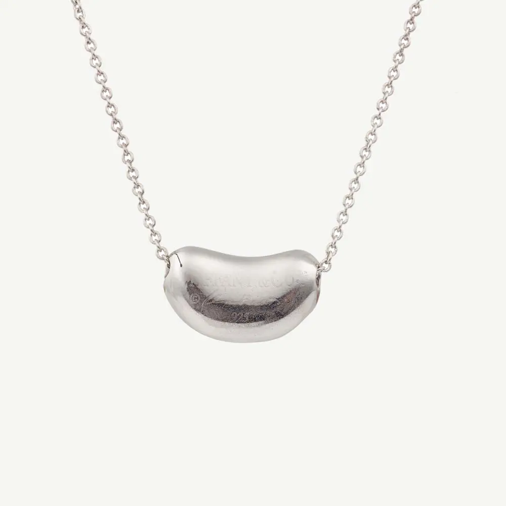 Pendentif Bean Tiffany & Co d’occasion en argent 925 reprenant la forme d’un haricot bombé coulissant sur une chaine maille jaseron fine, en argent. Le haricot seul mesure environ 1,8 cm et la chaîne mesure environ 40 cm.