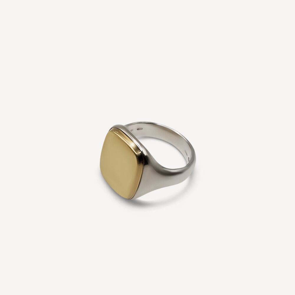 Le duo or argent et la forme rectangulaire de cette chevalière la rend résolument moderne et unisex.