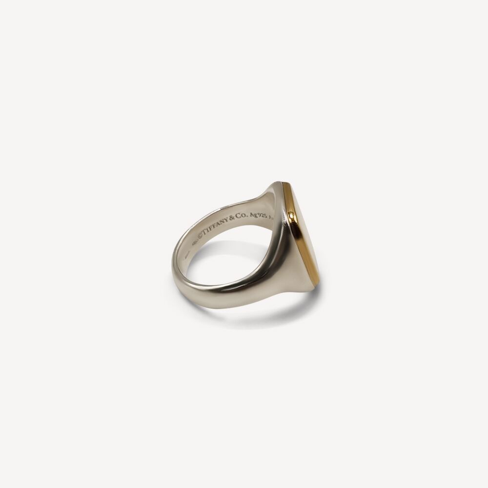 Chevalière Tiffany de Tiffany & Co de seconde main en or jaune 18 carats (750/1000) et en argent.