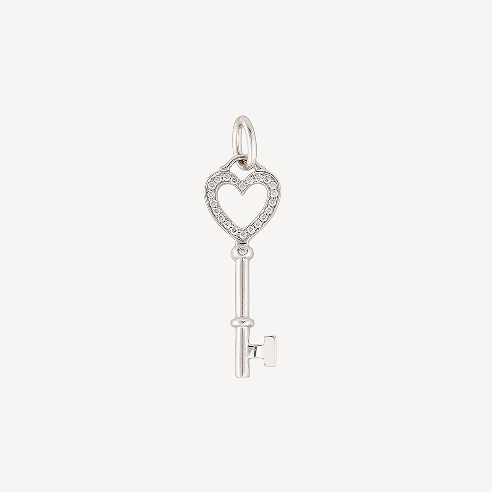 Pendentif Clé Coeur Tiffany & Co de seconde main en or blanc 18 carats (750/1000). Pendentif en forme de petite clé au motif de coeur et serti de diamants taille brillant.