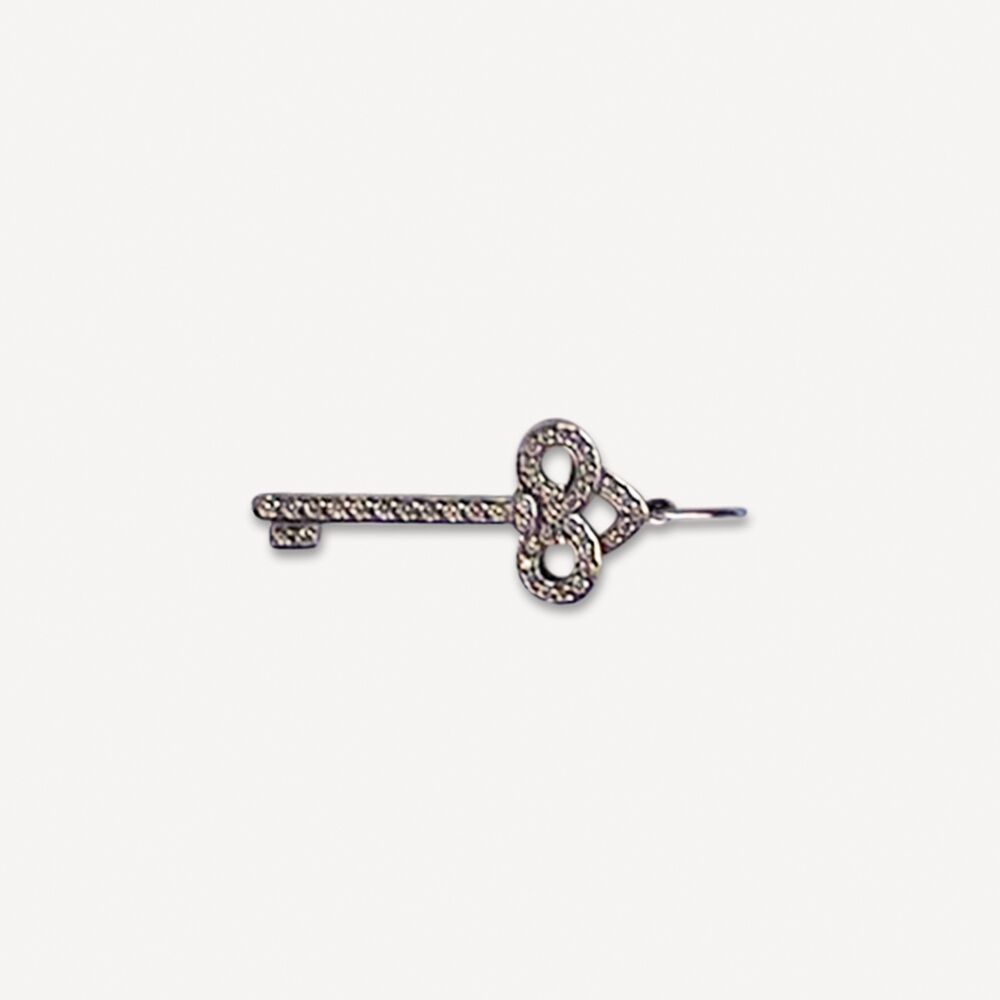 Pendentif Clé Coeur Tiffany & Co d’occasion en or blanc 750/1000 (18K) et diamants. Le pendentif figure une clé de dimension environ 2,5 cm, ornée d’une fleur de lys ajourée finement serti de diamants taille brillant. Le bout de la clé présente un T. La clé est retenue par une fine bélière arrondie. Vendu sans chaîne. Signature : Tiffany & Co.