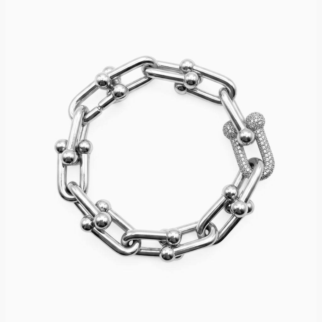 Bracelet Tiffany HardWear Tiffany & Co. d’occasion en or blanc 750/1000 (18K). Ce bracelet se compose d’une succession de larges maillons en forme de « U » allongés formant une chaîne. Chaque maillon est ponctué de deux petites sphères métalliques à ses extrémités lui donnant du relief. L’un d’eux est entièrement pavé de diamants taille brillant. Longueur du bracelet : 19 cm. Bijou signé Tiffany & Co.