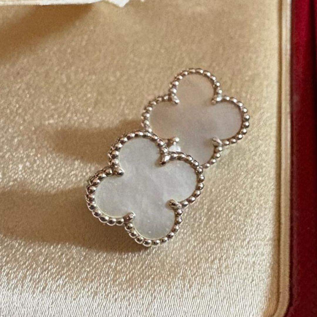 Boucles d’oreilles Vintage Alhambra Van Cleef & Arpels de seconde main en or blanc 18 carats (750/1000), ornée du motif trèfle emblématique de la Maison, en nacre blanche dans un serti perlé.
