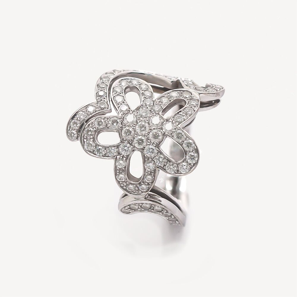 Bague Flowerlace Van Cleef & Arpels d’occasion en or blanc 750/1000 (18K) avec un motif de dentelle florale ajouré pavé de diamants. Taille 54.