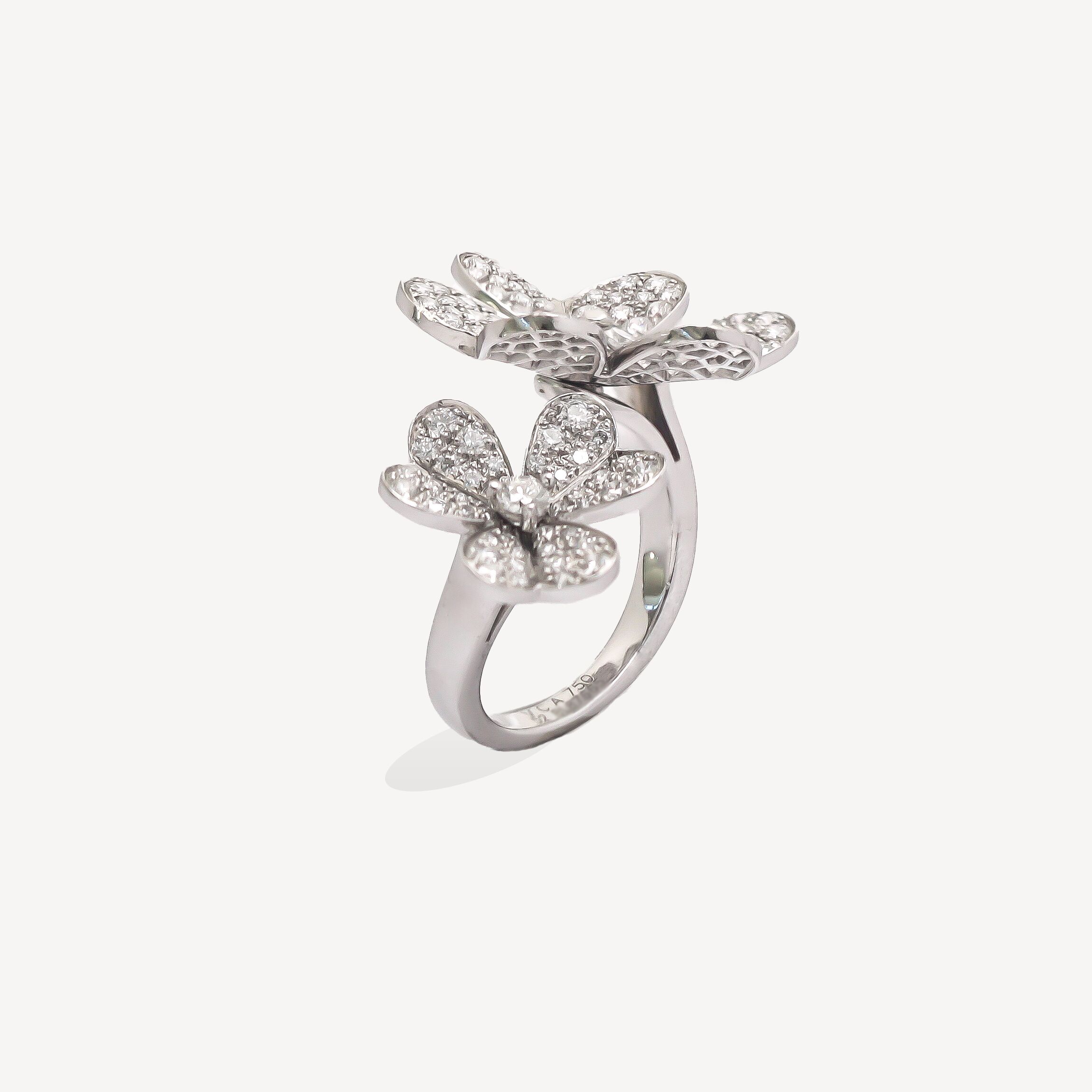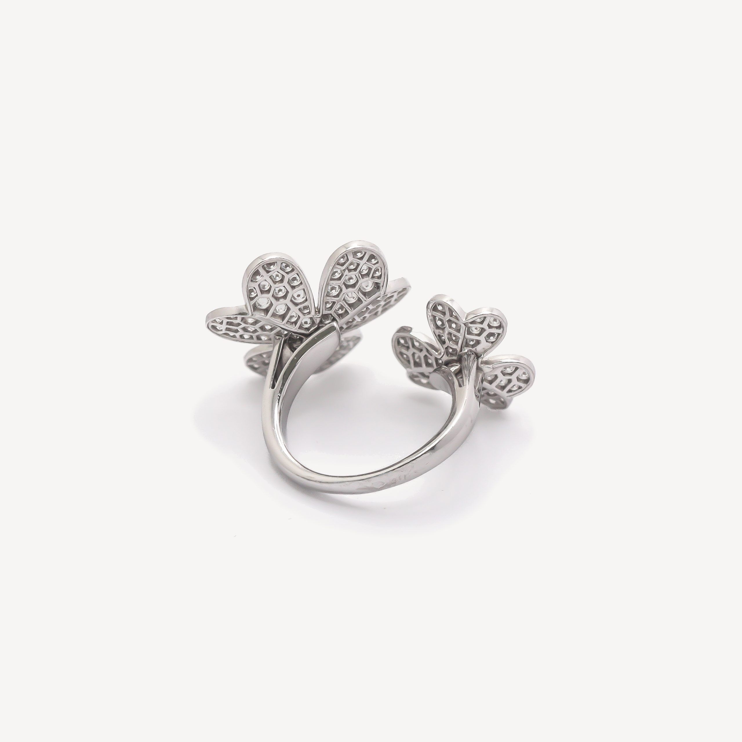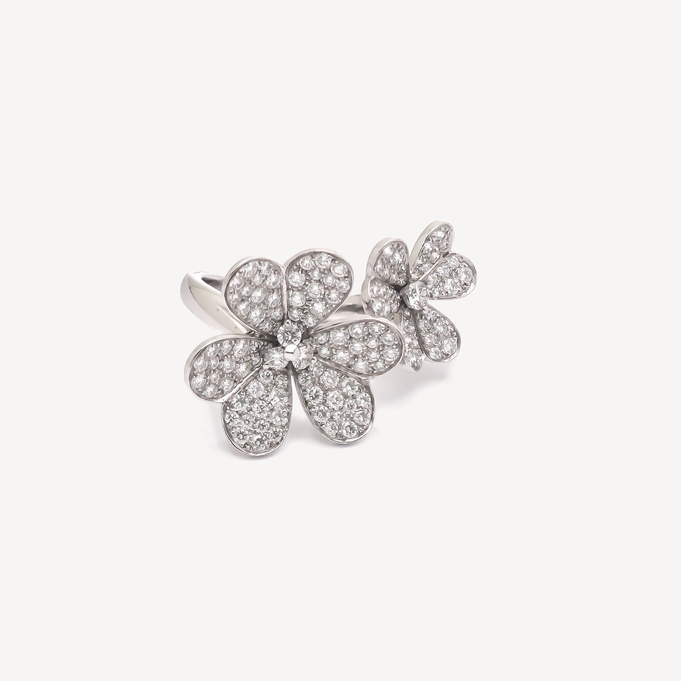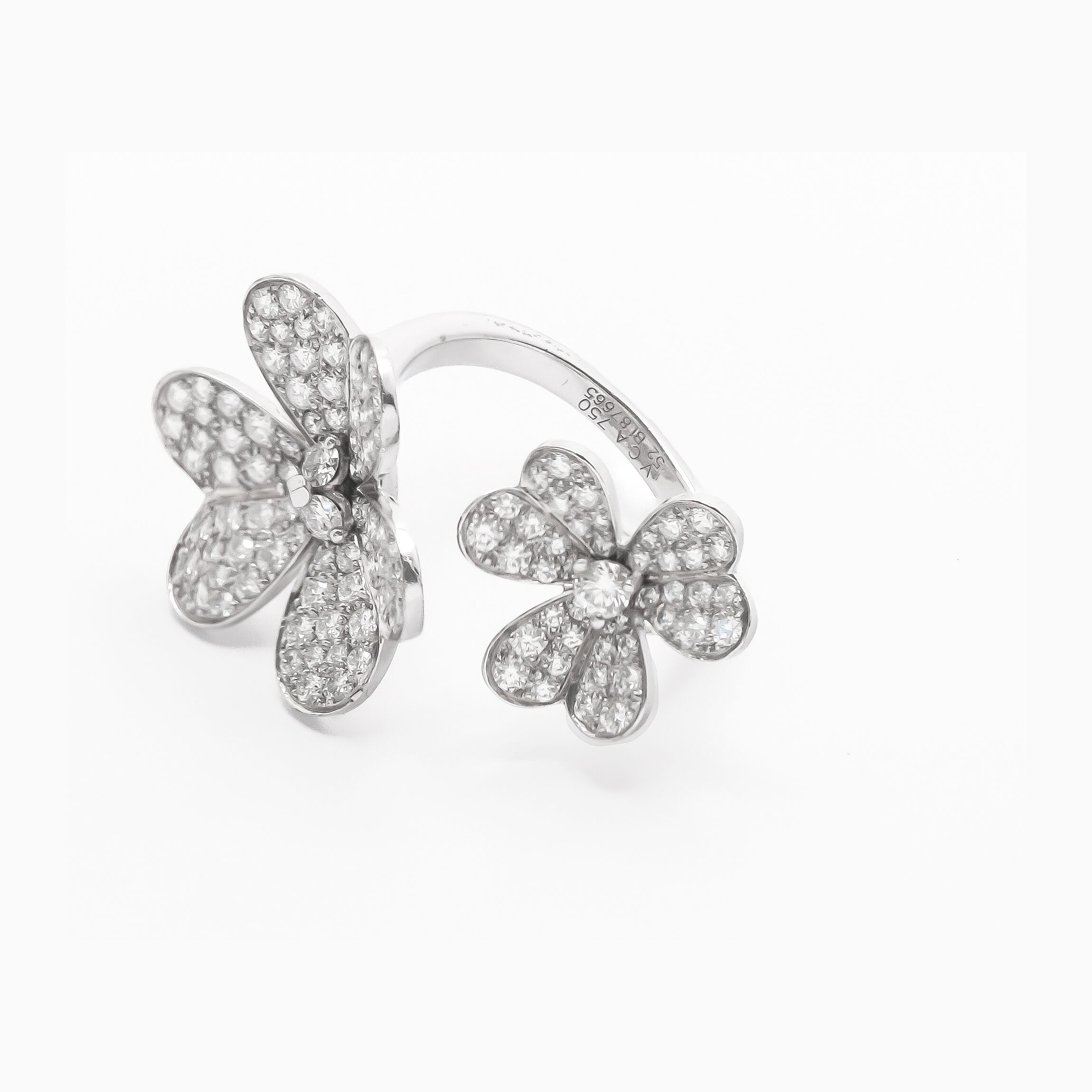 Bague Entre les doigts Frivole Van Cleef & Arpels d’occasion en or blanc 750/1000 (18K) avec un motif en forme de trèfle à 3 feuilles pavé de diamants. Taille 54.