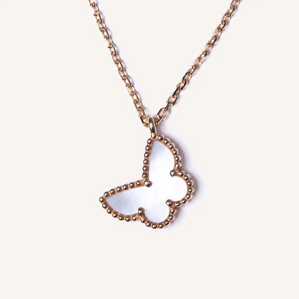 Collier Sweet Alhambra Van Cleef and Arpels d’occasion en or jaune 750/1000 (18k), avec pendentif mobile de papillon orné de nacre blanche dans un serti perlé, sur chaine maille forçat de 40 cm avec anneau de raccourcissement à 2 cm. Fermoir mousqueton signé et plaque rectangulaire numérotée. Le motif iconique de la marque est ici décliné en taille plus petite que le classique, et en forme de papillon. Le motif est non amovible. Marquages Van Cleef & Arpels et poinçons.