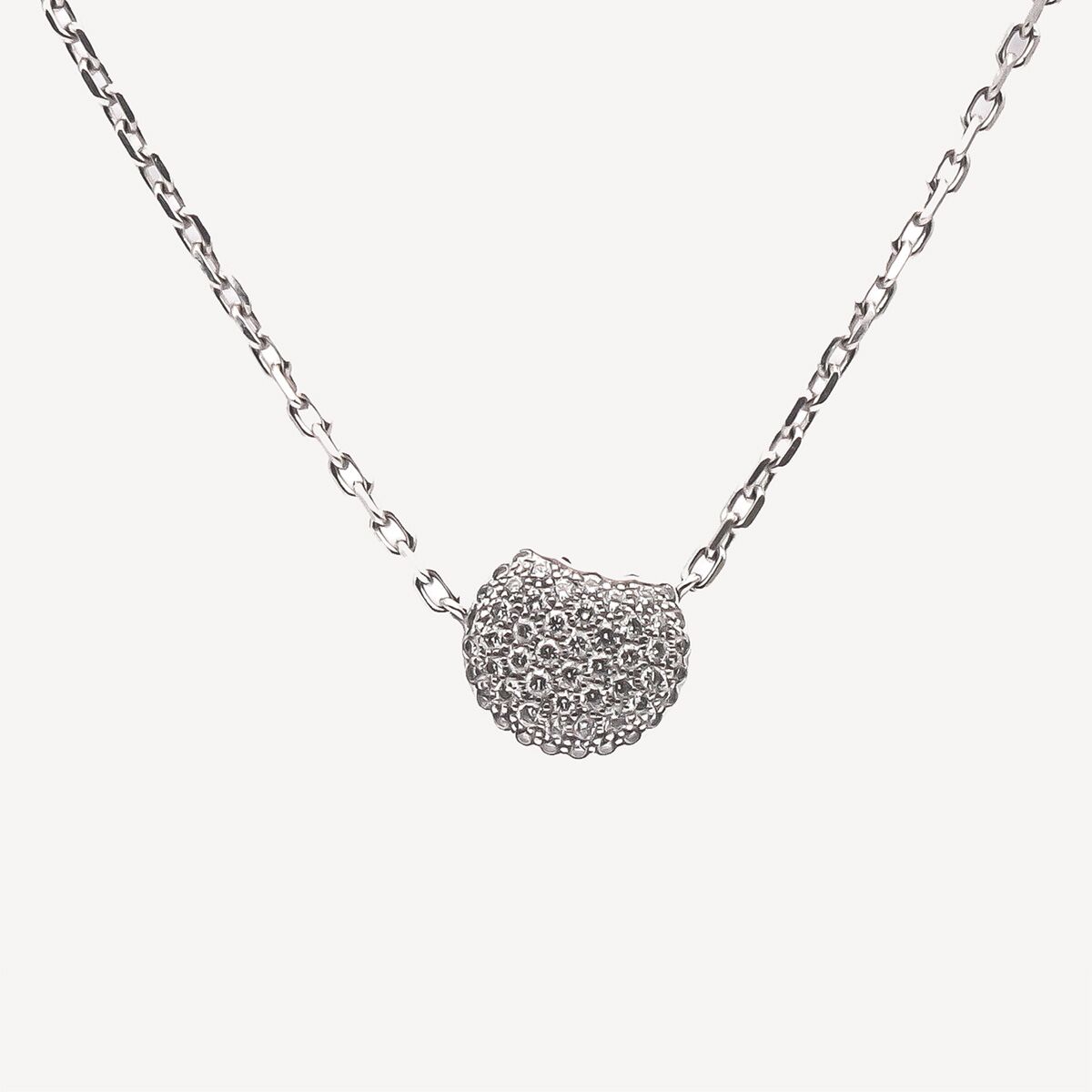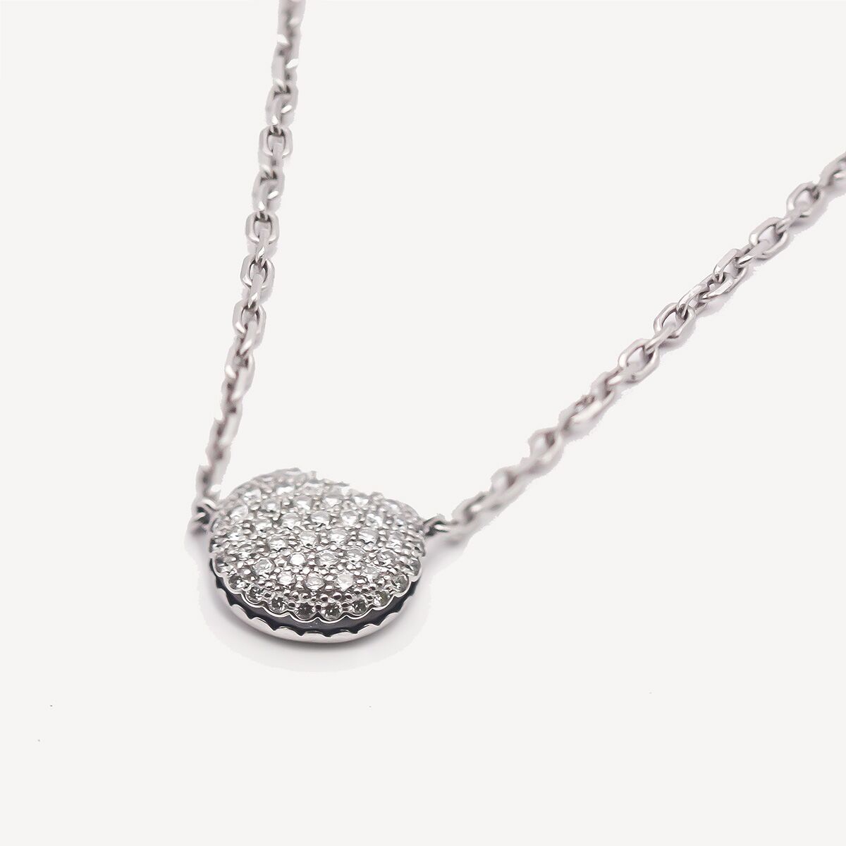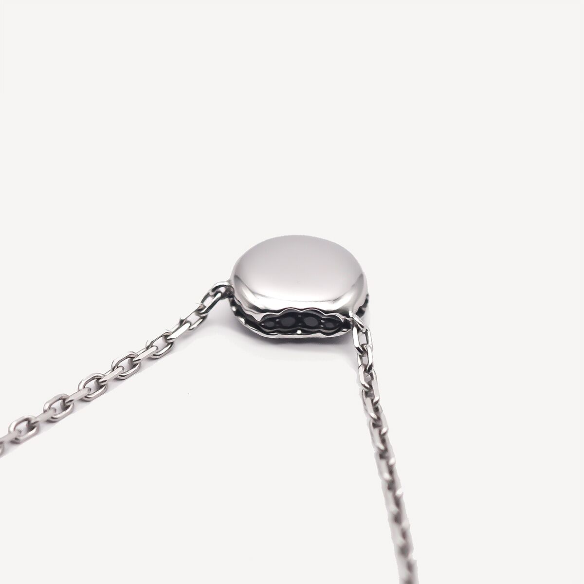 Boucheron second-hand Tentation Macaron necklace in 18-carat (750/1000) white gold and diamonds. The partially curved macaroon-shaped motif is paved with brilliant-cut diamonds on one side and partially with black stones on the other. The fixed motif is mounted on a forçat chain with a snap hook. The design is not removable. The length is adjustable with a shortening ring.