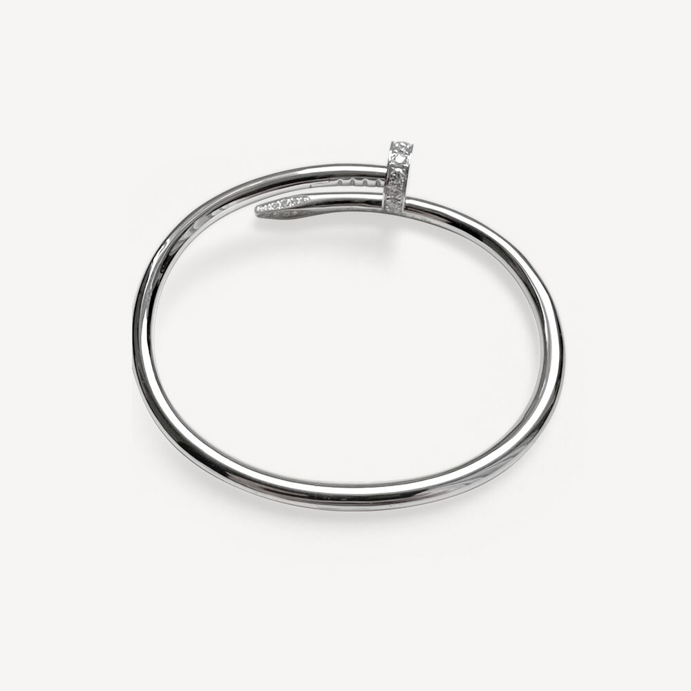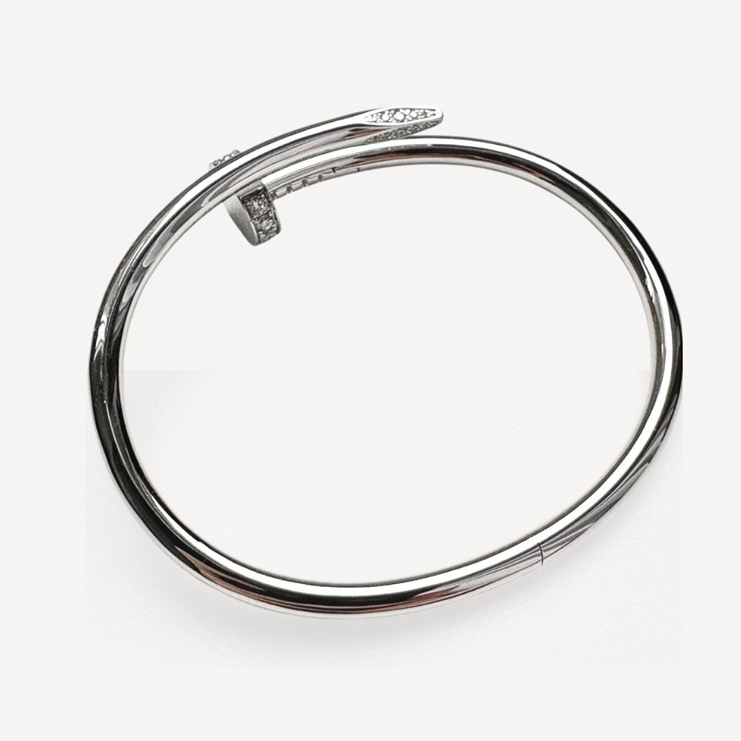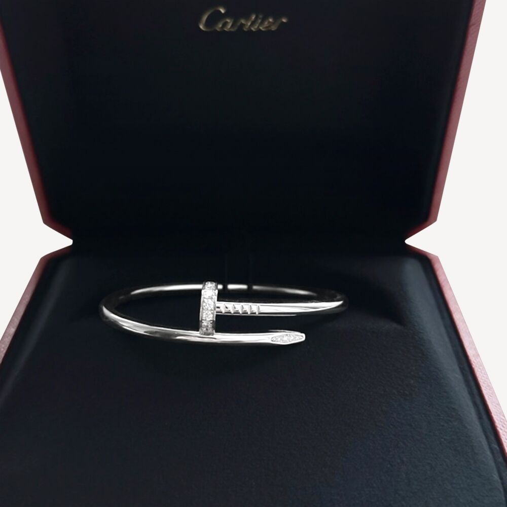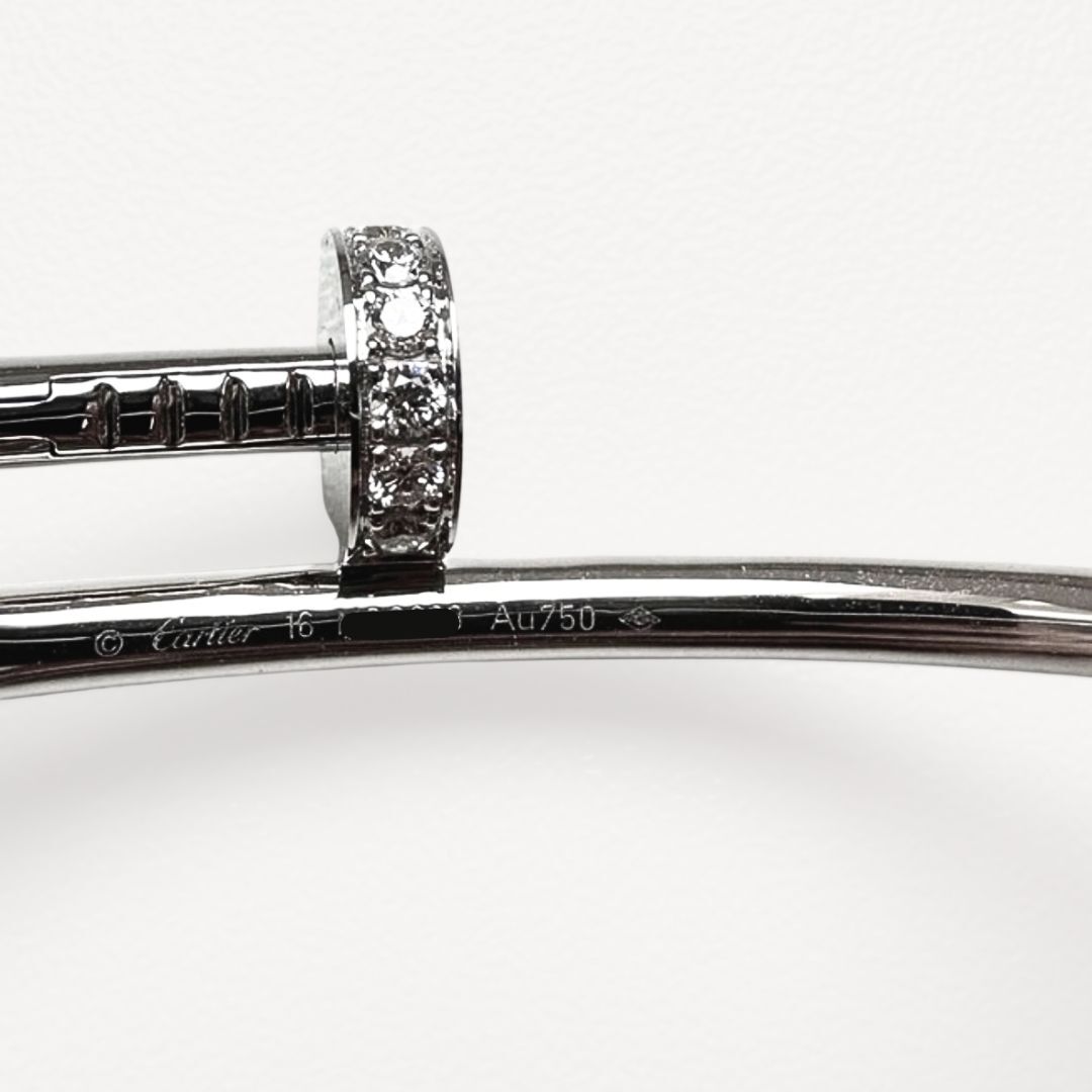 Bracelet Juste un Clou Classic Cartier d’occasion en or blanc 750/1000 (18K). Ce bracelet rigide présente un design en forme de clou stylisé qui s’enroule autour du poignet, avec une finition polie caractéristique de la collection Juste un Clou. Tour de poignet : 16 cm (correspond au diamètre du bracelet). Largeur : 3,5 mm. Bijou Cartier signé. Pavage diamants sur la tête du clou et la pointe