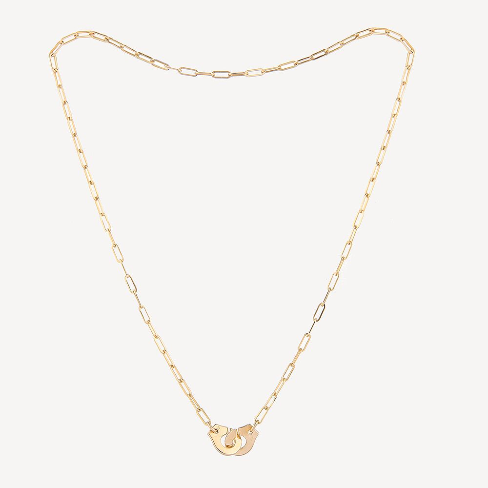Second-hand Dinh Van R8 handcuff necklace in 750/1000 (18K) yellow gold. The necklace features a pair of handcuffs that also act as a clasp. They are held by a DINH VAN chain link. The signature DINH VAN can be seen on one side of one of the handcuffs, motif size: 10 mm. Chain length: 35 cm. Signed and authenticated Dinh Van jewellery.