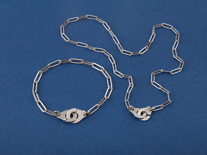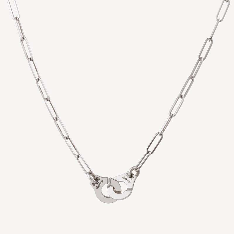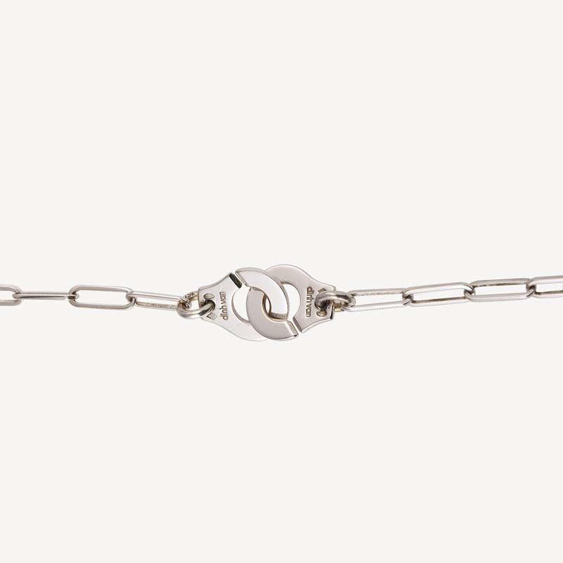 Second-hand Dinh Van handcuff necklace in 750/1000 (18K) white gold: a pair of 10 mm handcuffs acting as a clasp, on a white gold horse chain.