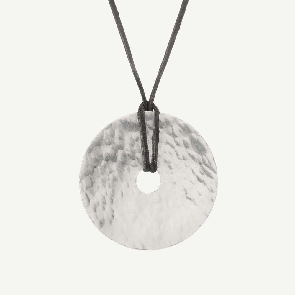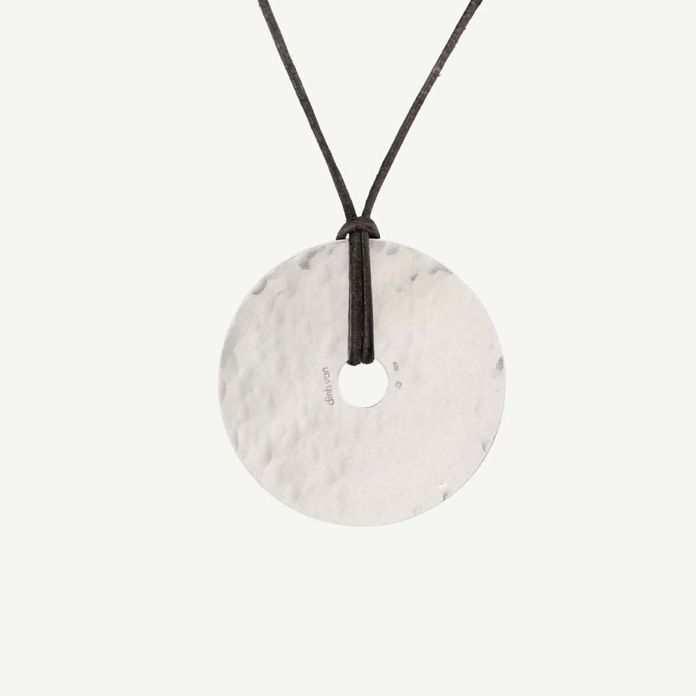 Second-hand Pi Dinh Van pendant in 925/1000 sterling silver. The pendant is a flat hammered silver disc approximately 45 mm in diameter. Its surface is irregular and hammered by hand. The centre of the disc is hollowed out to allow a cord to pass through.