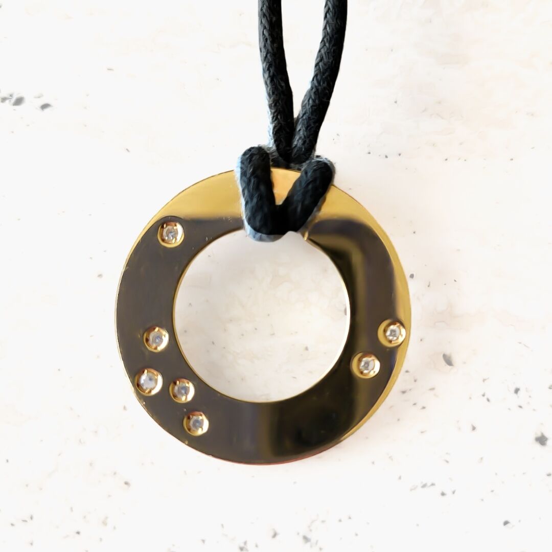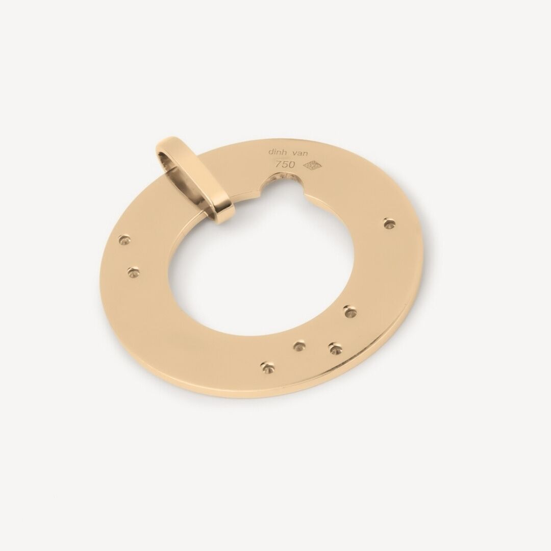 Second-hand Dinh Van Target pendant in 18 carat (750/1000) yellow gold. Second-hand jewellery consisting of a yellow gold circle decorated with diamonds, with a notch to accommodate the cord holding it.
