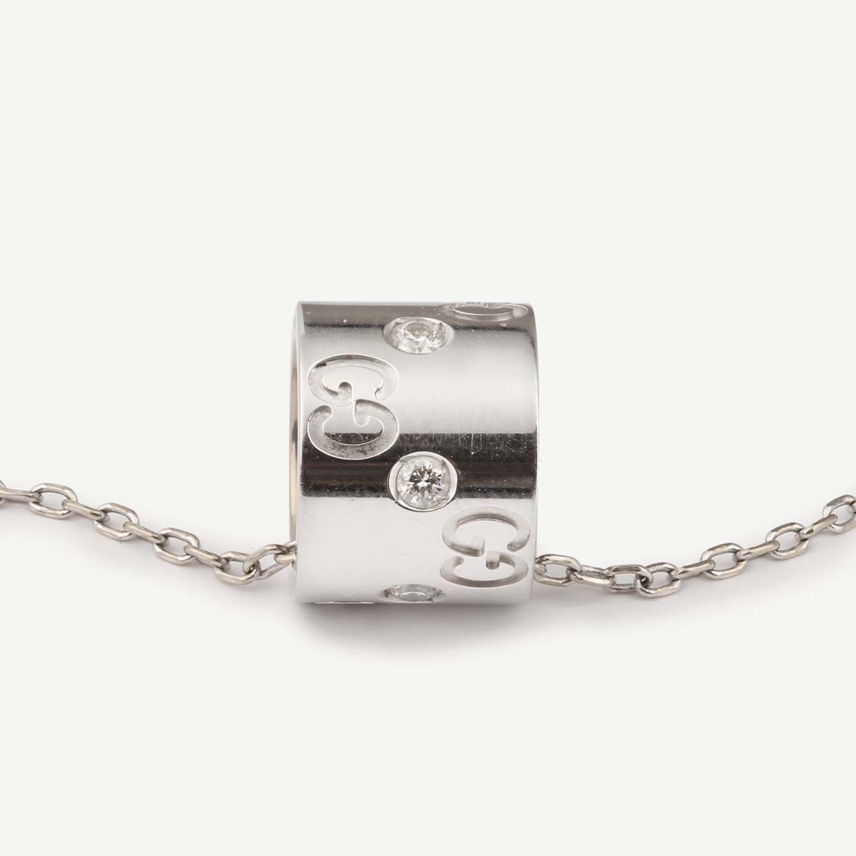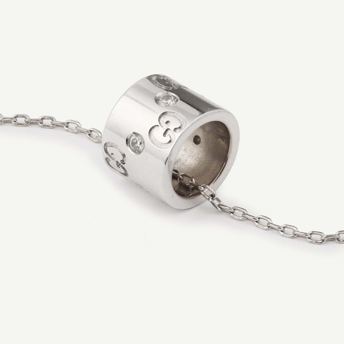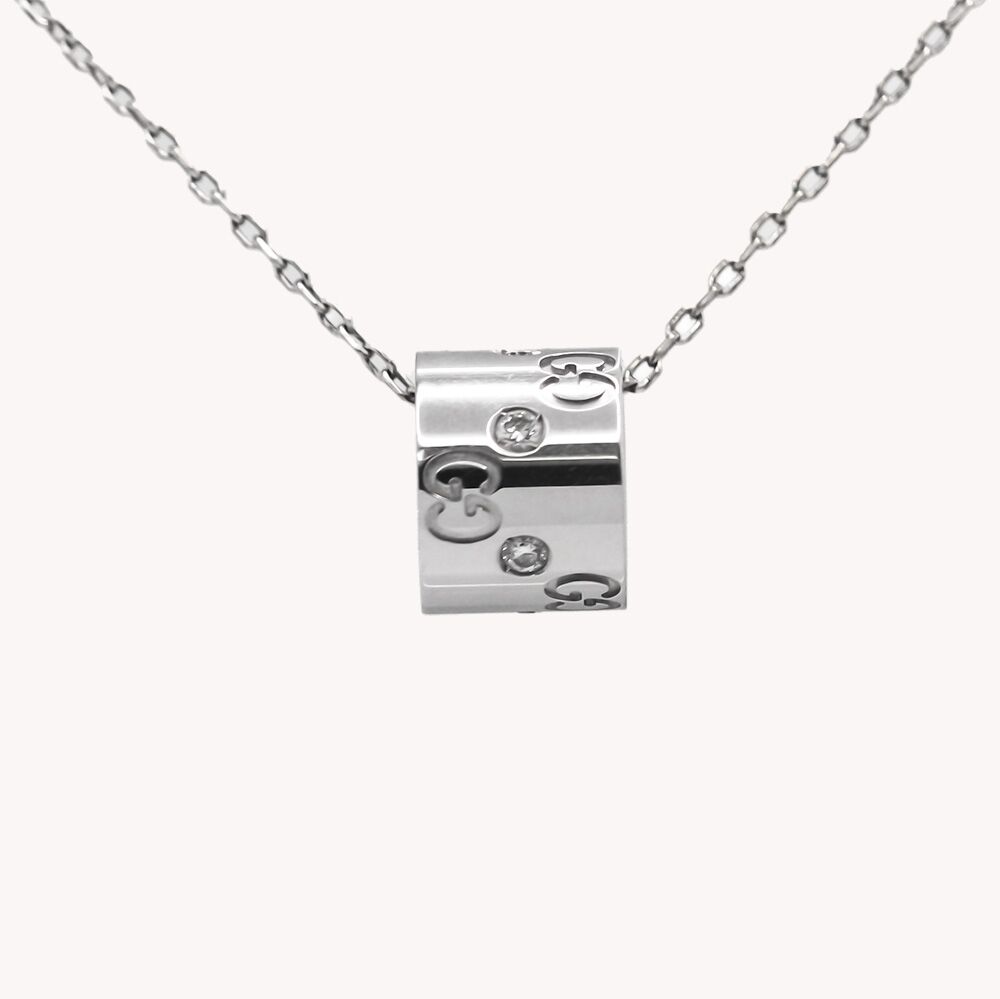 Collier Gucci en or blanc 750/1000 / 18 K de la collection Icon composé d’une chaîne en or blanc maille forçat que retient un anneau cylindrique large gravé du GG entrelacé de Gucci et parsemé de diamants.