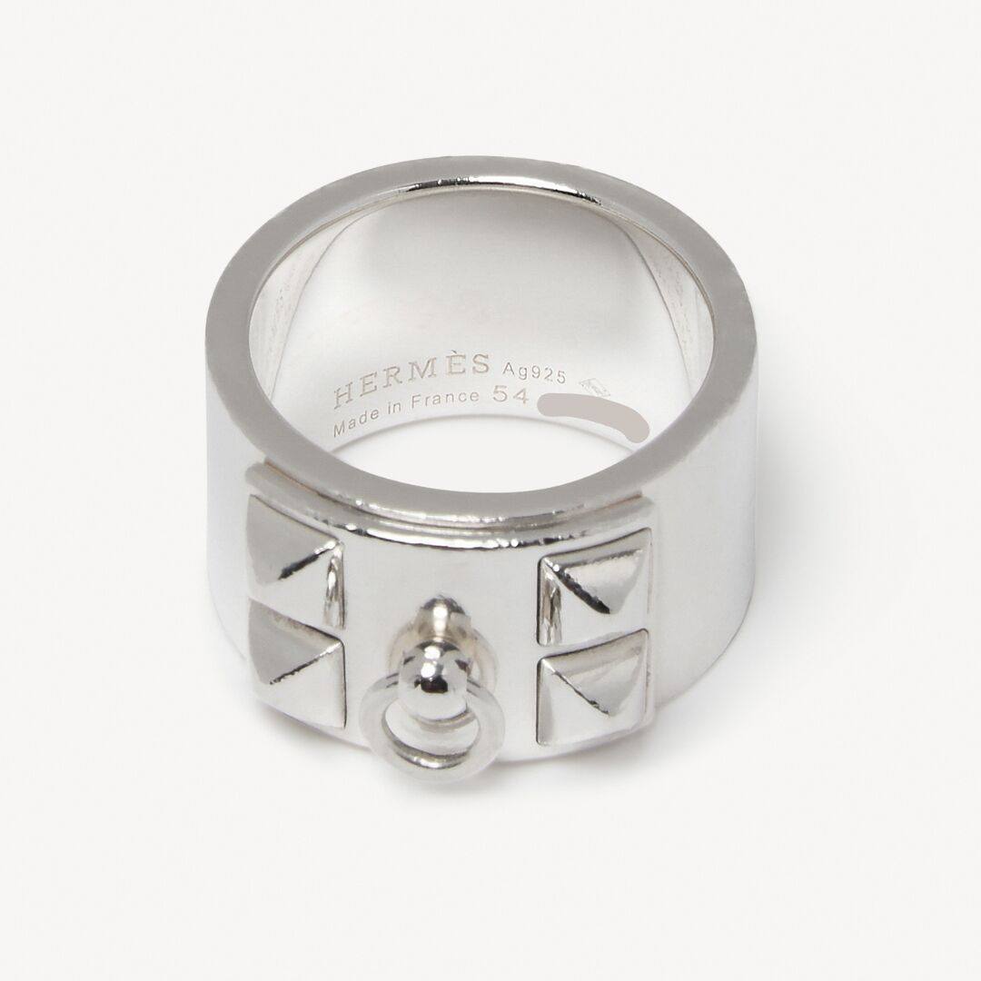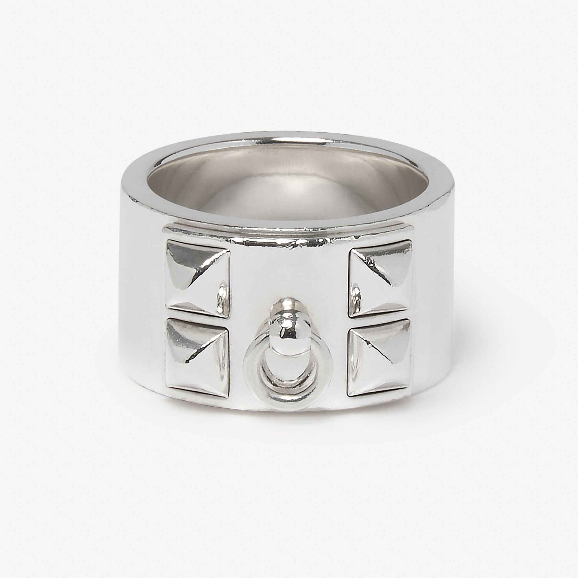Second hand Hermès Dog Collar ring in 925/1000 sterling silver. An imposing band ring with an iconic design, adorned with details such as pyramid studs and a mobile ring. Width: 1.2 cm. Finger size: 54.