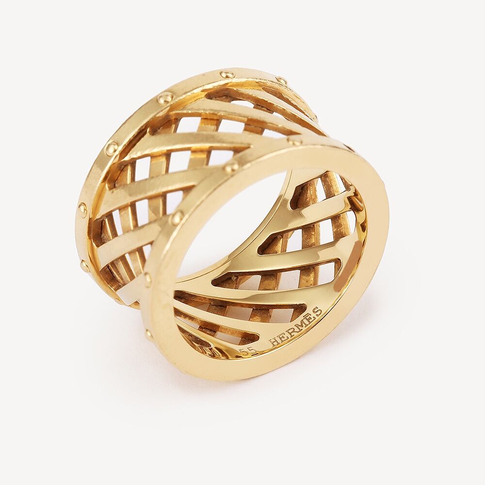 Second-hand Hermès Structure ring in 750/1000 (18K) yellow gold. A wide band measuring approximately 1.2 cm wide featuring a central openwork trellis motif, surrounded by a band itself enhanced with small rounded nail heads. Size 55. Signature: Hermès and numbered.