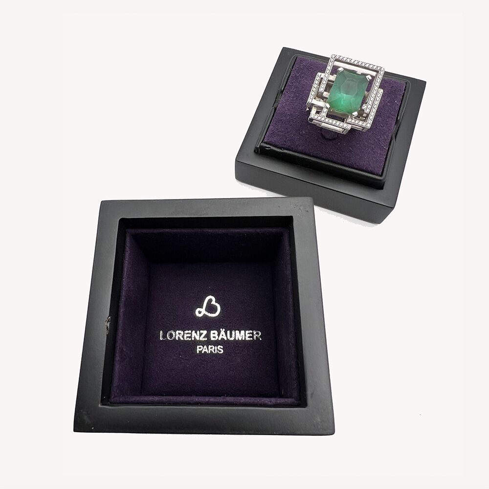 Second-hand Lorenz Bäumer Architect Labyrinth ring in 750/1000 (18K) white gold. The setting and body of the ring represent a labyrinth with the stone at its heart, whose brilliance is enhanced by the diamonds. A rectangular chevron-cut green tourmaline in a 4-claw setting at the centre of a voluminous labyrinth, set with diamonds.