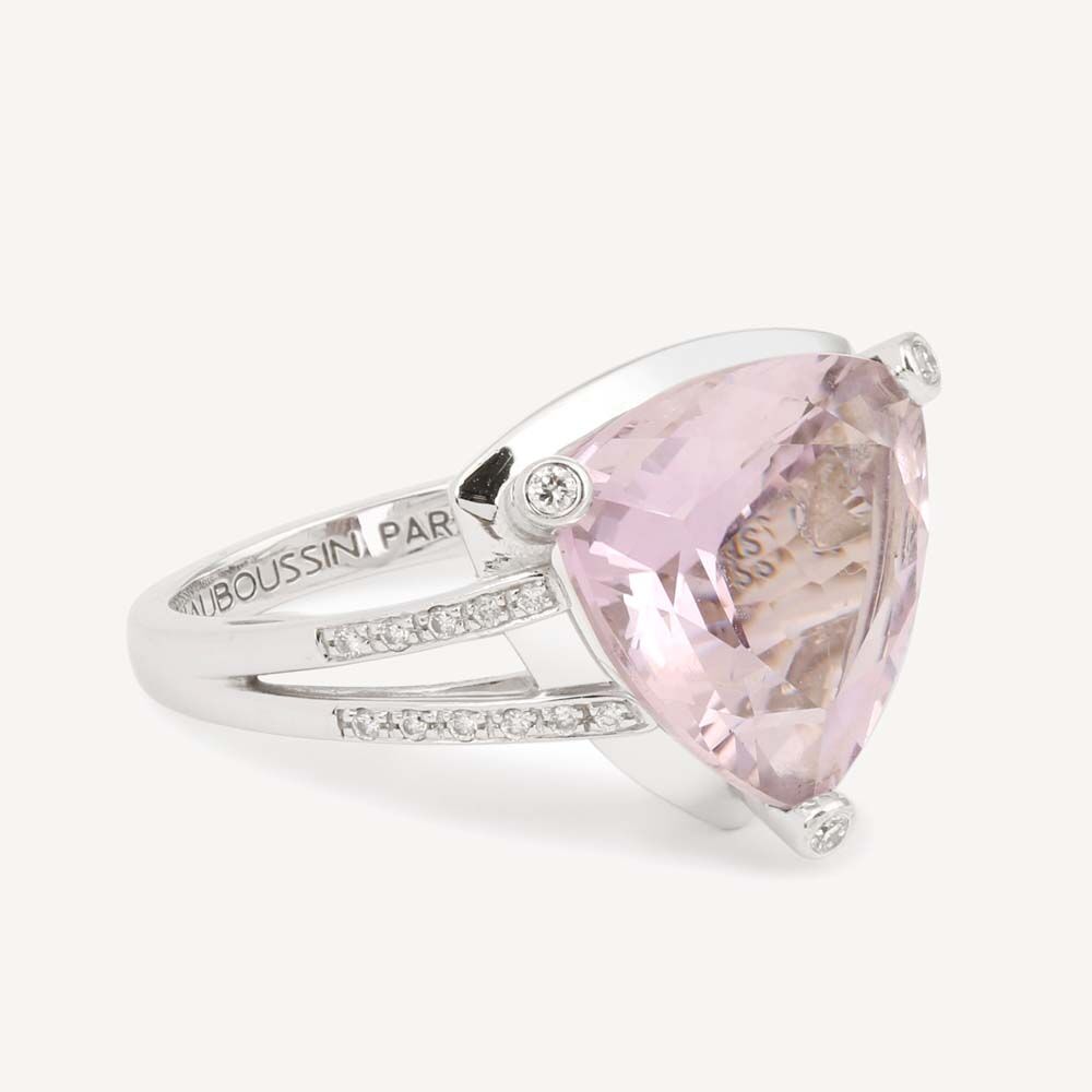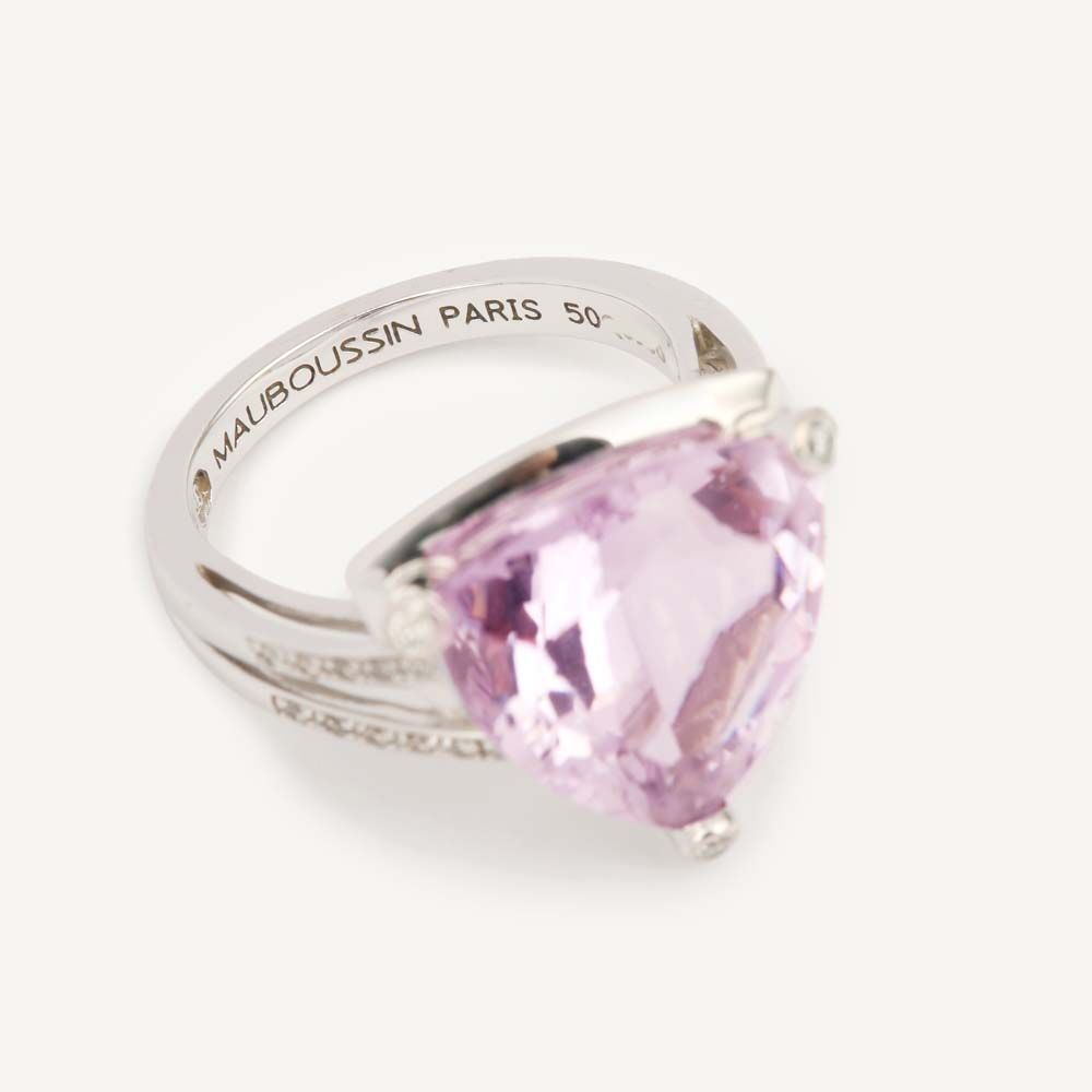 Second-hand Mes Couleurs à Toi Mauboussin ring in 750/1000 (18K) white gold. Centred on a large mauve-pink trillion-cut amethyst, known as the rose de France, held by three claws set with a brilliant-cut diamond. The setting is finished with two palmettes set with a line of brilliant-cut diamonds. Signed MAUBOUSSIN PARIS inside the ring.