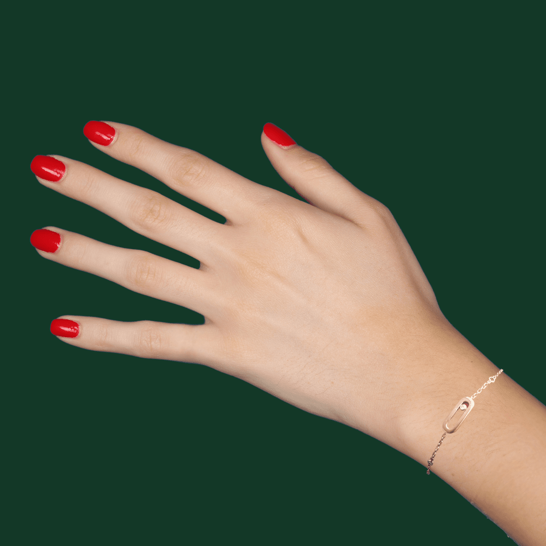 Pre-owned Messika Care Messika bracelet in 750/1000 (18K) Rose Gold and Diamond. The bracelet features a delicate design with an oval motif mounted on a chain, with diamond paving on the oval and a mobile diamond in a closed setting inside the motif. 1 small diamond in a closed setting on either side of the motif. Chain length: 18 cm (5 closing rings), motif length: 10 mm. Messika jewel, signed and numbered.