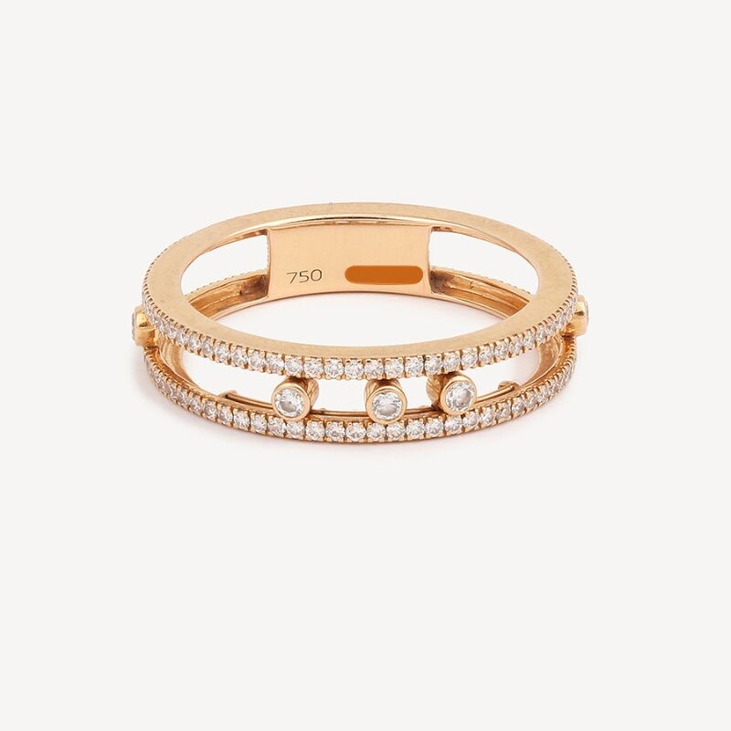 Bague Move Romane Messika d’occasion en or rose 750/1000 (18K). La bague présente 2 anneaux fins tout deux pavés de diamants, espacés de vide dans lequel 3 diamants sont en mouvement. Vendue avec sa boîte Messika.