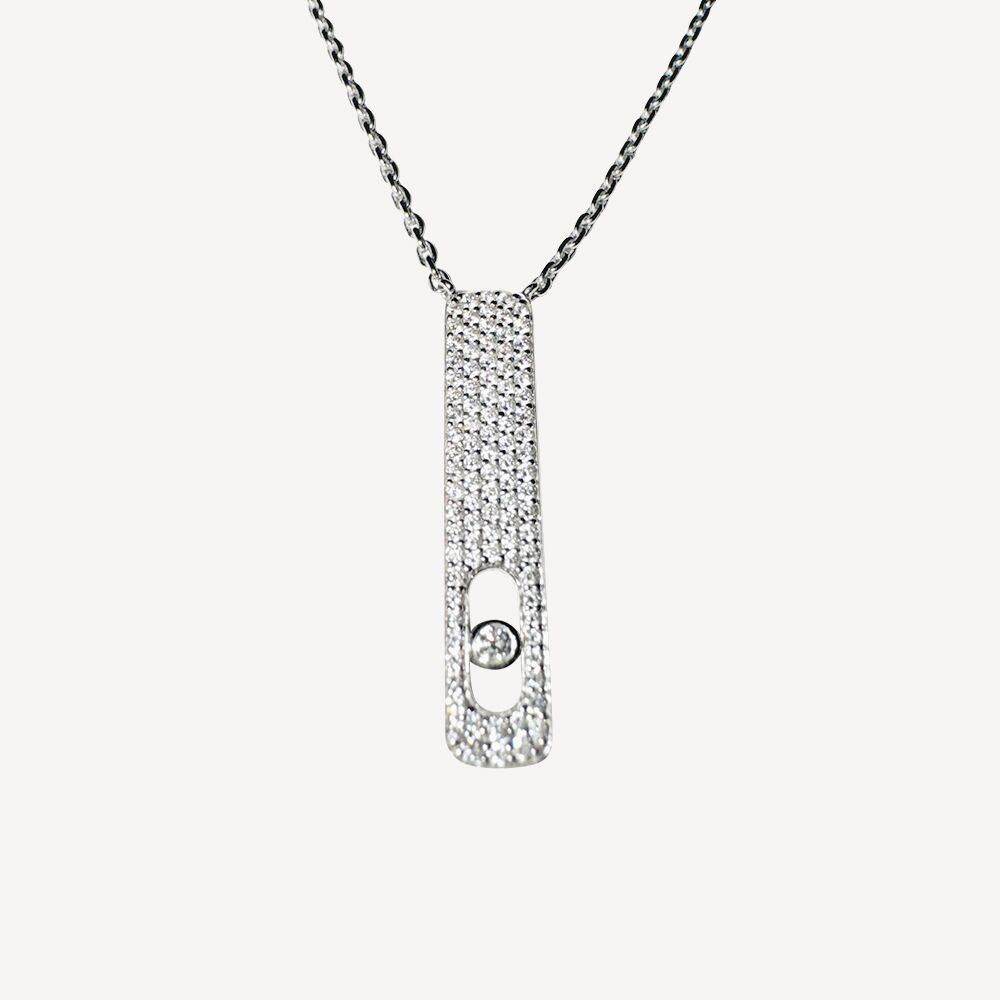 Second-hand My First Diamond Pavé Messika necklace in 750/1000 (18K) White Gold and Diamond. The necklace features a rectangle motif entirely paved with diamonds, with a mobile diamond at the bottom centre. Chain length: 45cm (5 adjustment rings). Design size (LxW): 23.3 x 4.4 mm. Signed Messika jewel.