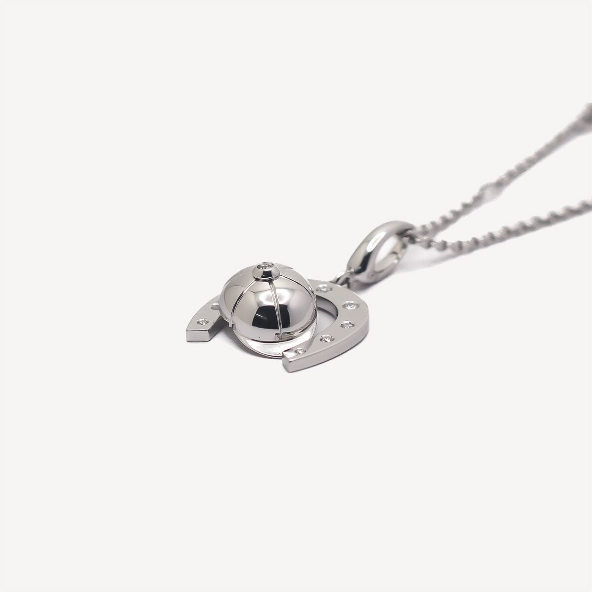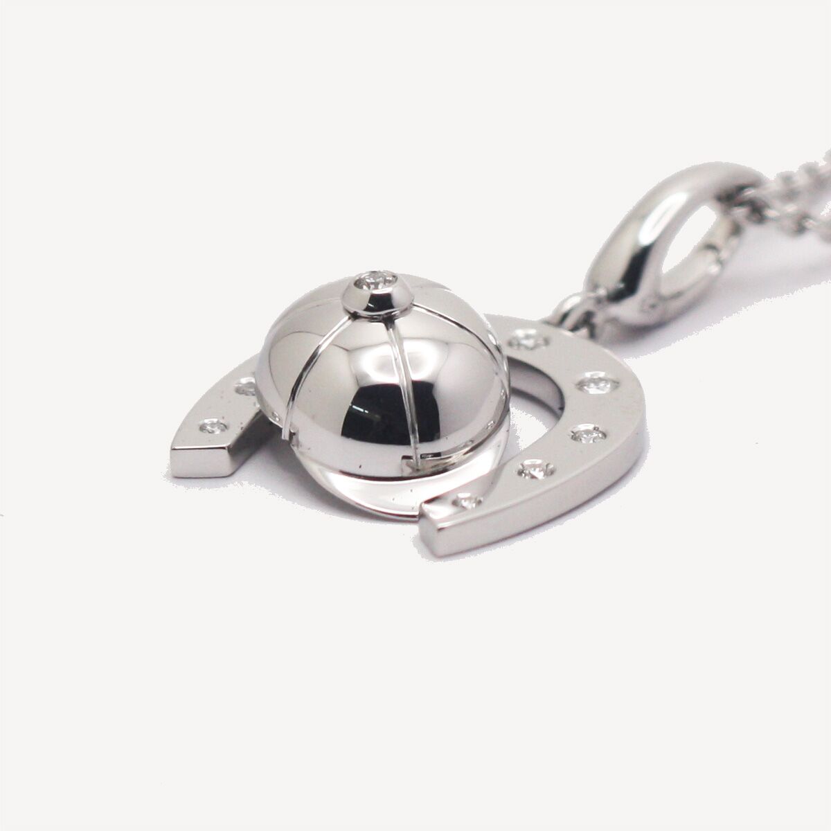 Second-hand Polo Piaget pendant in 750/1000 white gold representing a horseshoe set with 8 diamonds holding a white gold riding helmet enhanced with a diamond. The charm is worn with an opening clasp. Pendant sold without chain. A very rare Piaget creation, a second-hand piece of jewellery for women or men that has been produced in limited quantities.