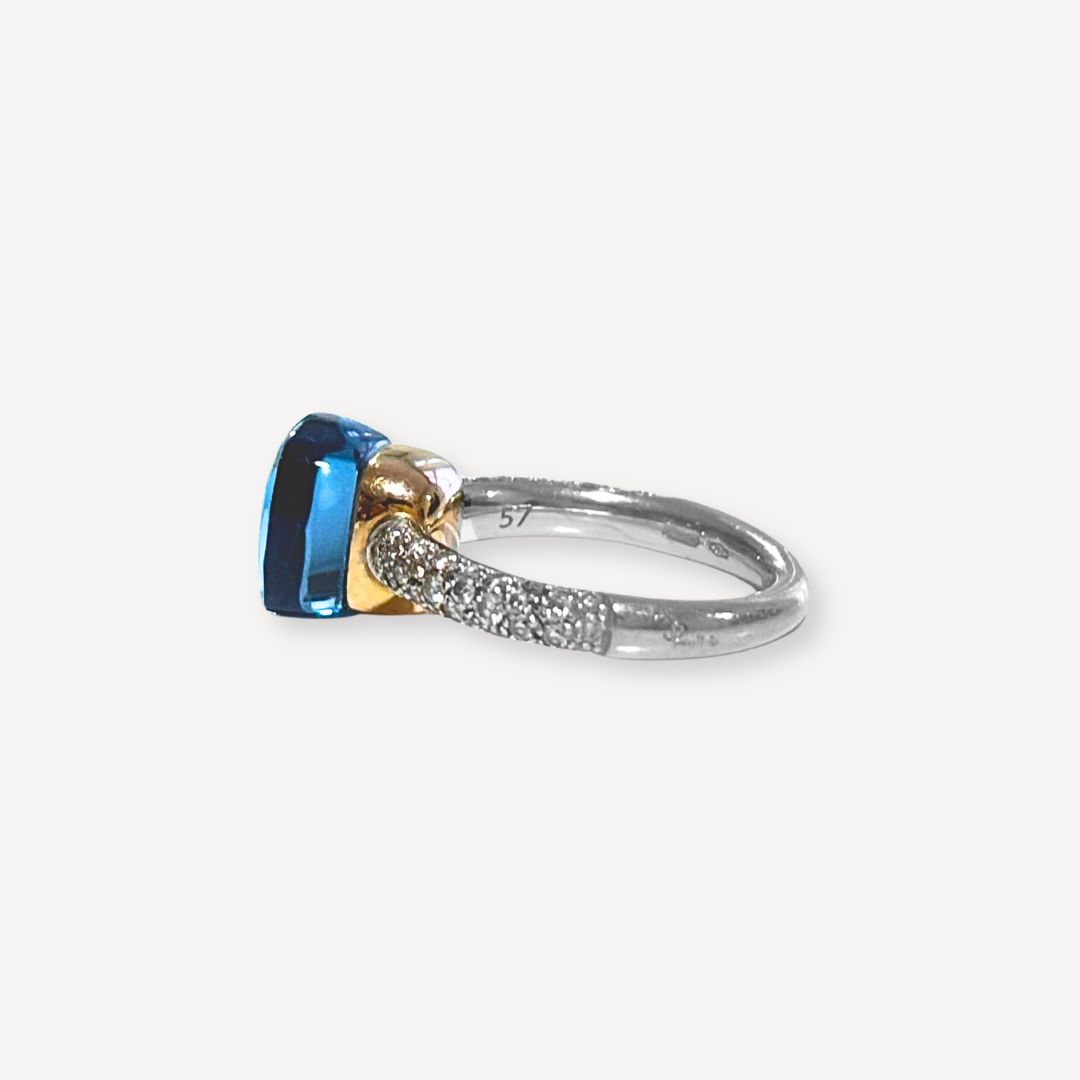 Bague Nudo Classic Pomellato d’occasion en or blanc 750/1000 (18K) et topaze london blue. Ce bijou est formé d’un jonc arrondi en or rose qui révèle une topaze london blue facetté, sur un anneau épais en or blanc semi-pavé de diamants taille brillant. Tour de doigt : 57. Bijou signé Pomellato.
