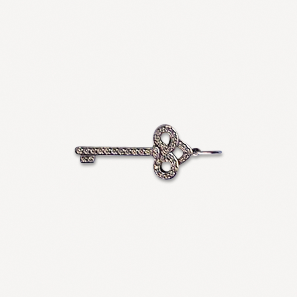 Pendentif Clé Coeur Tiffany & Co d’occasion en or blanc 750/1000 (18K) et diamants. Le pendentif figure une clé de dimension environ 2,5 cm, ornée d’une fleur de lys ajourée finement serti de diamants taille brillant. Le bout de la clé présente un T. La clé est retenue par une fine bélière arrondie. Vendu sans chaîne. Signature : Tiffany & Co.