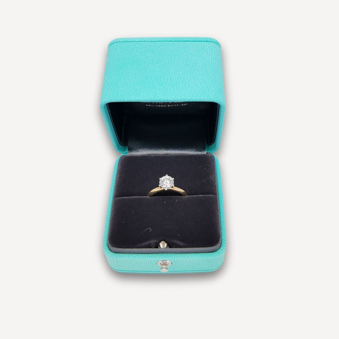 Solitaire Tiffany Setting Tiffany & Co de seconde main en Or Jaune 18 carats (750/1000) et Platine 950/1000 serti d’un diamant, une monture iconique à six griffes qui sublime l’éclat de la pierre précieuse.