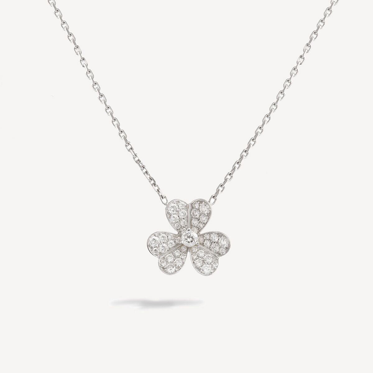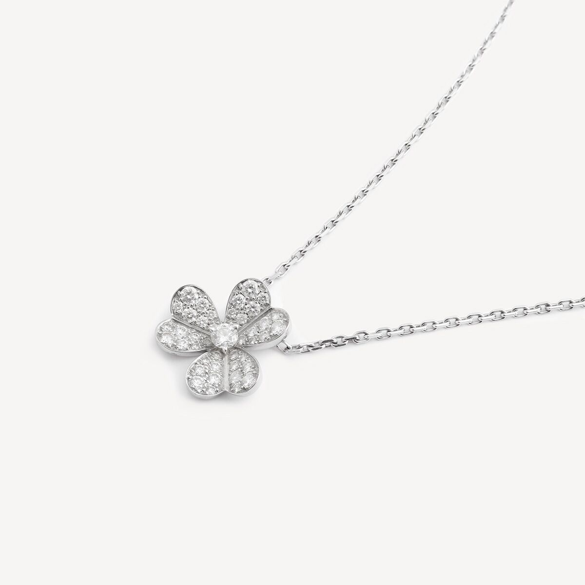 Frivole pendant by Van Cleef & Arpels, in 18-carat white gold with its diamond-paved cloverleaf.