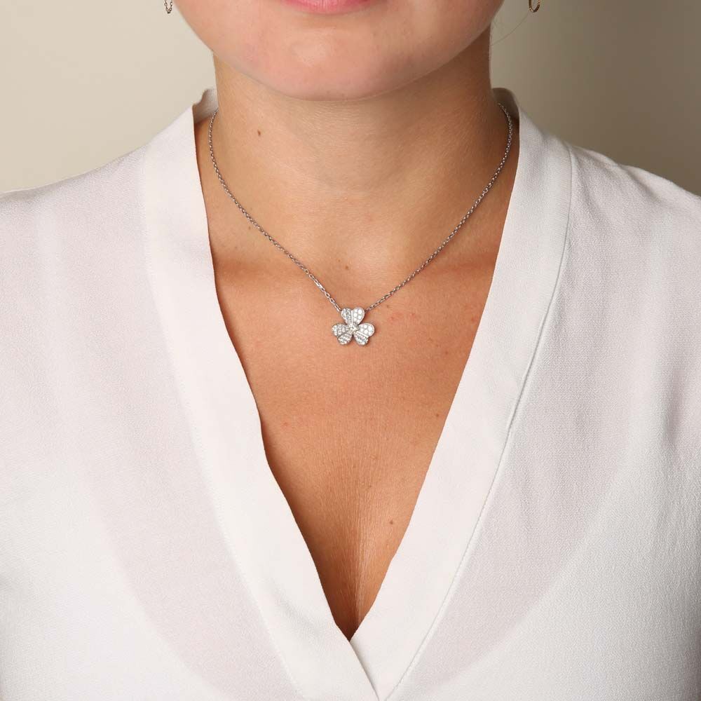 White gold pendant with 1 diamond-paved 3-leaf clover motif. The design is attached to the white gold chain, which is also non-removable. The clasp can be adjusted in size.